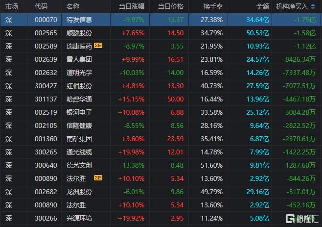龙虎榜中涉及机构专用席位的个股中,单日净卖出额前三为特发信息、顺灏股份、雪人集团,分别为1.75亿元、1.58亿元、8426.34万元。