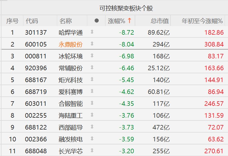 格隆汇12月15日|A股市场可控核聚变概念股普跌,截至收盘,哈焊华通、永鼎股份跌超8%,冰轮环境、常辅股份跌超6%,炬光科技跌超5%,爱科赛博、合锻智能(维权)跌超4%,海陆重工(维权)、西部超导、融发核电、长光华芯跌超3%。