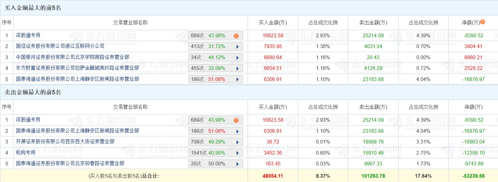 昨日涨停的雷科防务(002413.SZ)今日跌3.01%,换手率44.82%,成交额57.43亿元。龙虎榜数据显示,深股通买入1.68亿元,卖出2.52亿元,净卖出8391万元;一家机构买入3452万元,卖出1.58亿元,净卖出1.24亿元;游资“量化打板”位列卖三席位,净卖出1.9亿元。上榜席位全天买入4.81亿元,卖出10.13亿元,合计净卖出5.32亿元。(格隆汇)