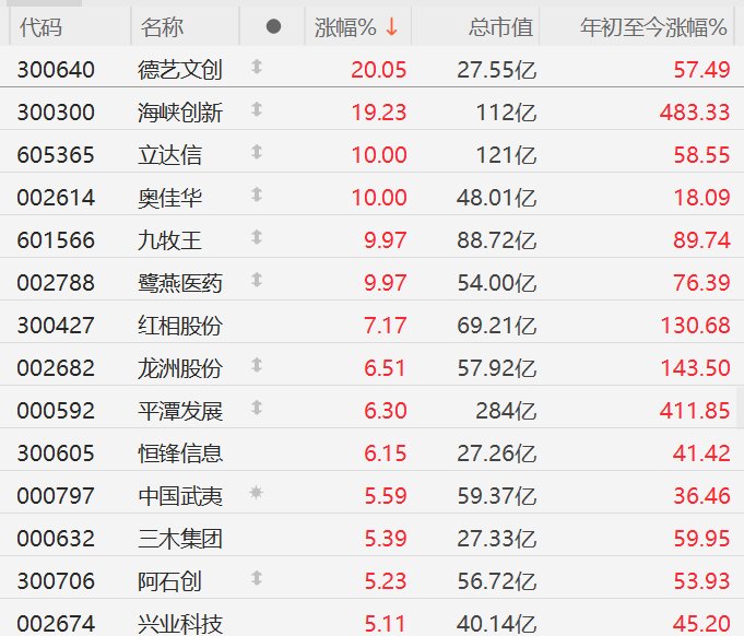 格隆汇12月18日|A股市场福建股走强,其中,德艺文创20CM涨停,海峡创新涨超19%,立达信、奥佳华、九牧王、鹭燕医药10CM涨停,红相股份(维权)涨超7%,龙洲股份、平潭发展、恒锋信息涨超6%,中国武夷、三木集团、阿石创、兴业科技涨超5%。消息面上,12月18日,人民日报头版头条刊发题为《福建深入实施新时代山海协作》通讯。