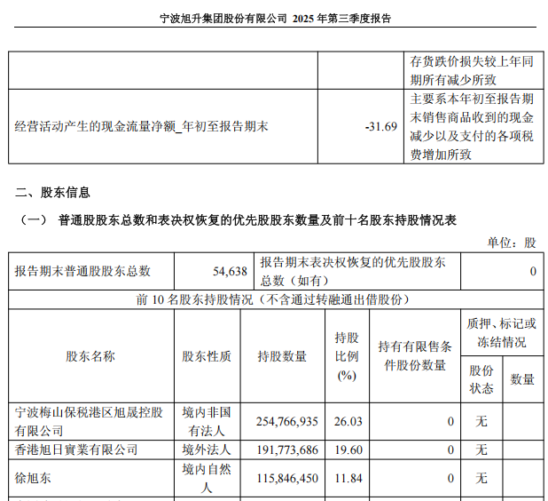 截至2025年第三季度末,旭晟控股、旭日实业、徐旭东是旭升集团的前三大股东,持股比例分别为26.03%、19.60%、11.84%。