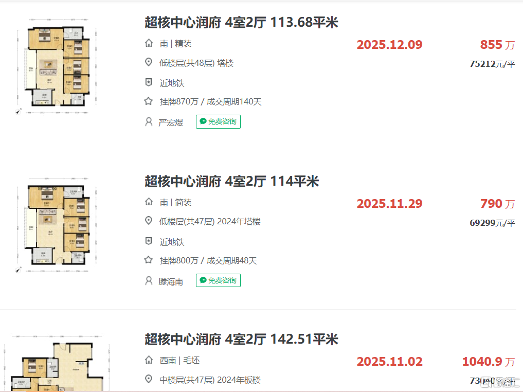 去年11月成交一套114平户型,总价约790万,12月成交一套约113.68平户型,总价约855万。