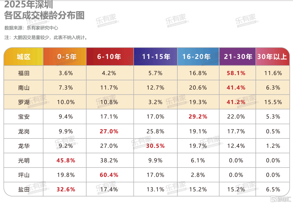 光明的市场成交,基本都集中在新房或者0-5年的次新房层面。根据乐有家研究中心数据,从去年深圳各区成交楼龄分布的情况来看,光明0-5年楼龄成交的占比最大,达到45.8%,若加上6—10年楼龄的成交占比,楼龄10年内的成交占比就达到84%。