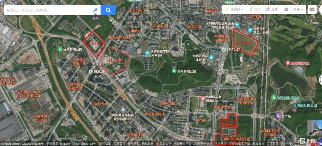这几宗宅地紧邻深圳实验学校光明部、光明区城市规划展览馆、光明区图书馆、光明区群众体育中心、光明区政务服务中心、光明新城公园、6 号线凤凰城地铁站、13 号线二期北延站点等关键配套等。