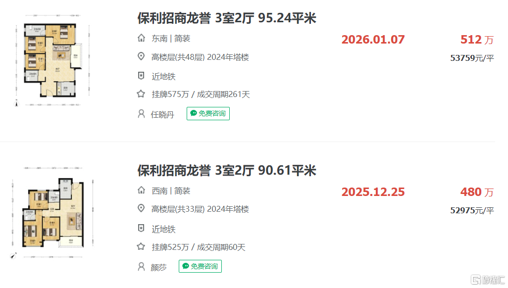 比如2022年及2023年分期入市的保利龙誉,入市最低总价分别为约569万(约82平备案总价)及约521万(约79平备案总价)。