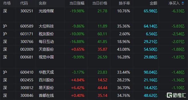 龙虎榜单日净卖出额前三为光线传媒、大位科技、税友股份,分别为6.33亿元、5.83亿元、2.54亿元。