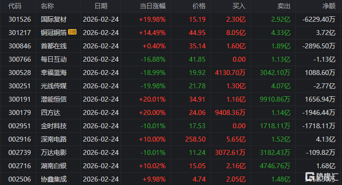 龙虎榜单日净买入额前三为华工科技、深南电路、湖南白银,分别为5.23亿元、4.21亿元、3.44亿元。
