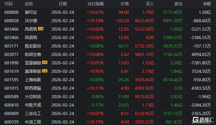 龙虎榜中涉及机构专用席位的个股中,当日净买入额前三为华工科技、上海电影、三变科技,分别为1.89亿元、1.85亿元、1.55亿元。