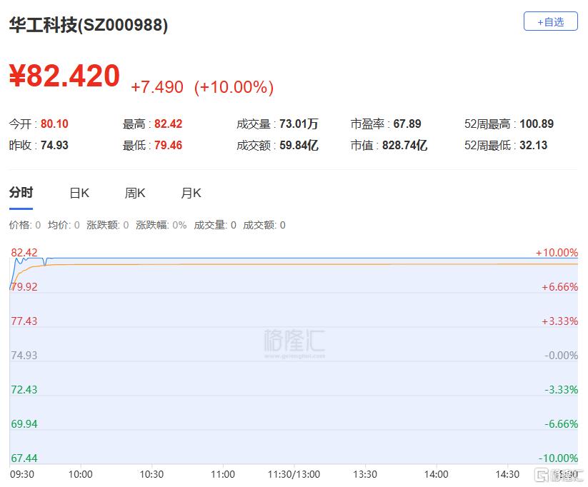 华工科技:今日涨停,换手率7.26%,成交额59.84亿。龙虎榜数据显示,深股通专用席位净买入4.50亿元,机构净买入1.89亿元。