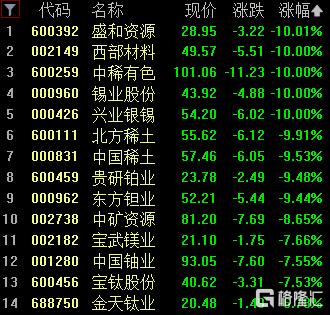 小金属板块走低,盛和资源、西部材料、中稀有色、锡业股份等跌停。