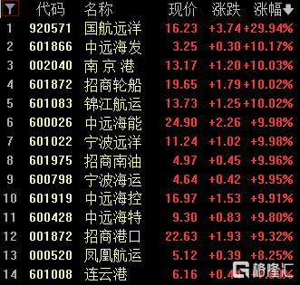 港口航运板块暴涨,国航远洋涨近30%,中远海发、南京港、招商轮船、锦江航运等多股涨停。