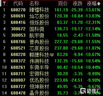 半导体板块大跌,臻雷科技、灿芯股份跌超13%,恒烁股份、国科微跌超12%。