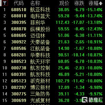 军工装备板块大幅回撤,航亚科技跌超15%,电科蓝天、菲利华跌超13%,纵横股份跌超12%。