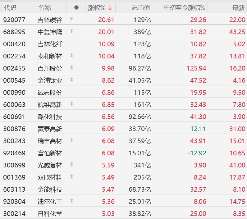 格隆汇3月12日|A股市场化工股全线上涨,其中,吉林碳谷涨超20%,中复神鹰20CM涨停,吉林化纤、泰和新材、百川股份10CM涨停,金浦钛业涨超8%,诚志股份、皖维高新、潞化科技(维权)、蒙泰高新、瑞丰高材、富恒新材涨超6%,光威复材、双欣材料、金能科技、迪尔化工、日科化学涨超5%。