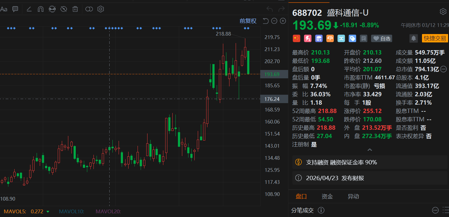 盛科通信(688702.SH)午间大幅收跌约9%,报193.69元,总市值跌破800亿元大关。消息上,盛科通信公告称,公司收到持股5%以上股东国家集成电路产业投资基金股份有限公司的告知函,其在2026年3月2日至2026年3月11日期间,通过集中竞价方式减持公司股份410万股,占公司总股本的比例由13.00%减少至12.00%,权益变动触及1%刻度。