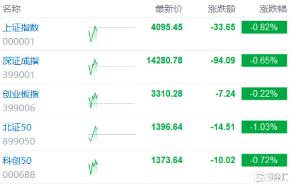 3月13日,A股三大指数早盘小幅震荡,尾盘集体下行,截至收盘,沪指跌0.81%报4095点,深证成指跌0.65%,创业板指跌0.22%。全市场成交额2.42万亿元,较前一交易日缩量433亿元,超3800股下跌。