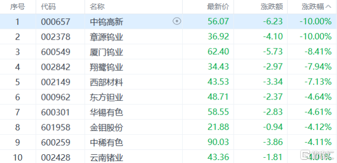贵金属、小金属等金属板块重挫,中钨高新跌停,厦门钨业跌超8%,招金黄金跌超5%,西部材料、翔鹭钨业等多股跟跌。