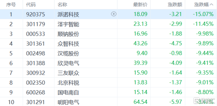 电网设备板块走低,派诺科技跌超15%,泽宇智能跌超11%,国电南自、明阳电气等多股跟跌。