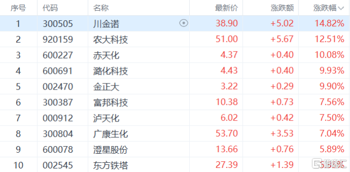 农化制品板块走强,金正大、潞化科技等多股涨停,川金诺涨超14%,农大科技、富邦科技等多股跟涨。