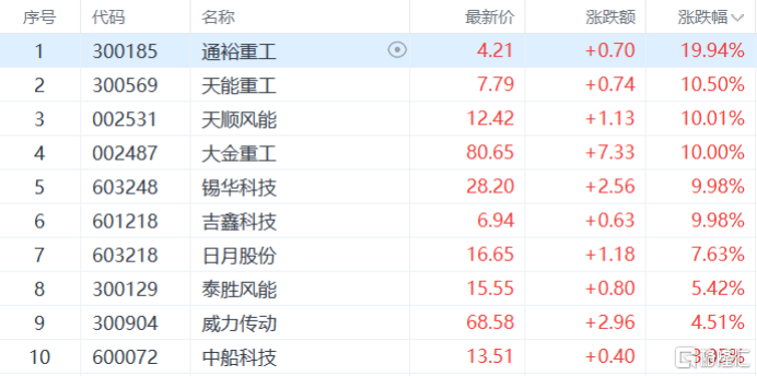 风电设备板块爆发,大金重工、通裕重工等多股涨停,日月股份涨超7%,泰胜风能、威力传动等多股跟涨。