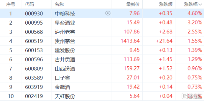 白酒板块上涨,中粮科技涨超4%,皇台酒业涨超3%,泸州老窖、贵州茅台等多股跟涨。