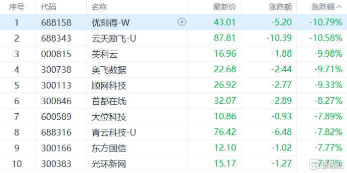 算力概念板块下跌,美利云跌停,首都在线等跌超8%,大位科技、东方国信(维权)等多股跟跌。