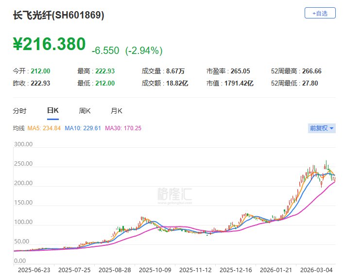 长飞光纤(601869.SH)今日开盘跌4.9%报212元,现跌幅收窄至约3%。长飞光纤公告称,股东长江通信因自身经营发展需要,拟自2026年4月10日至2026年7月9日,以集中竞价交易方式减持公司股份不超过100万股,占公司总股本的0.12%。(格隆汇)