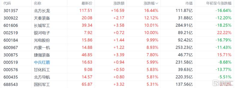 地面兵装、军工股大涨,北方长龙涨超16%,天秦装备涨超12%,长城军工、银河电子、光电股份等多股涨停,中兵红箭、北方导航涨超5%。华福证券认为,本周美伊军事冲突依旧,中东地缘风险持续,导弹、无人化、军贸等板块或迎来短期催化。开源证券指出,中东局势升级背景下,军贸军售有望提速。