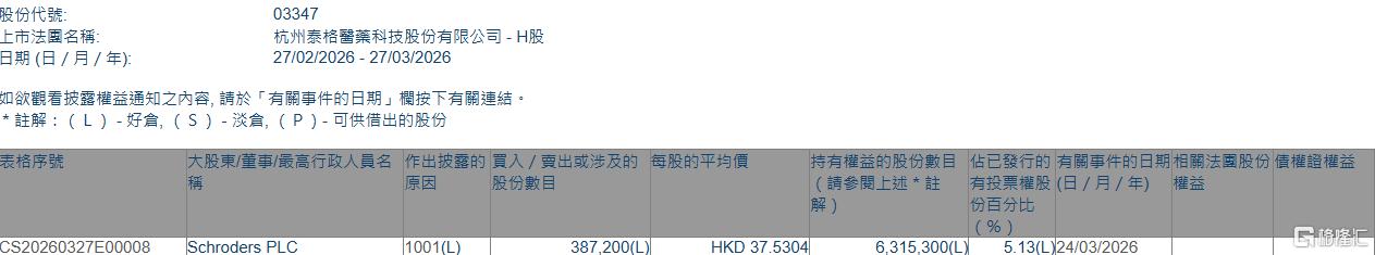 格隆汇3月27日丨根据联交所最新权益披露资料显示,2026年3月24日,泰格医药(03347.HK)获Schroders PLC在场内以每股均价37.5304港元增持38.72万股,涉资约1453.2万港元。