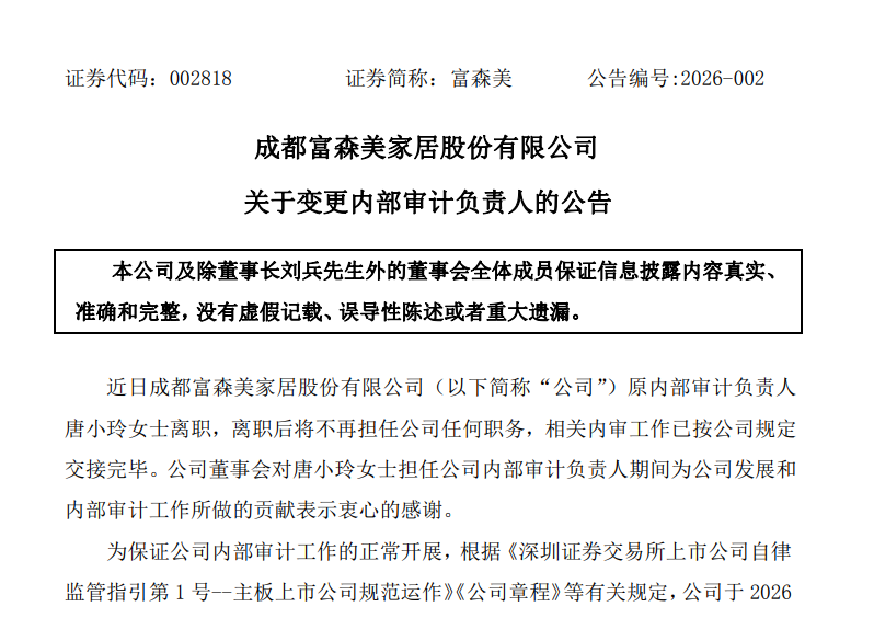 1月6日,富森美(002818.SZ)发布公告,公司原内部审计负责人唐小玲离职,离职后将不再担任公司任何职务,相关内审工作已按公司规定交接完毕。