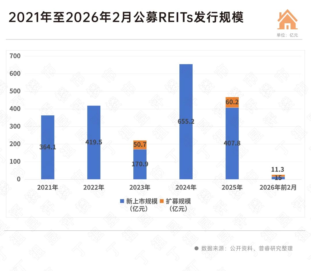 据普睿研究统计,2025年上市的公募REITs募集资金总额为468亿元,其中扩募规模60.2亿元。截至2026年2月底,我国公募REITs已上市的总规模已经达到了2154.7亿元。