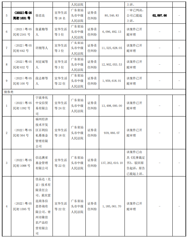 公告显示,公司近期收到广东省汕头市中级人民法院送达的三起诉讼案件一审《民事判决书》(【(2022)粤05民初637号】、【(2022)粤05民初1774号】、【(2022)粤05民初1631号】),案件判决与示范案件(【(2022)粤05民初1808号】)一审判决一致,公司已对上述案件提起上诉。