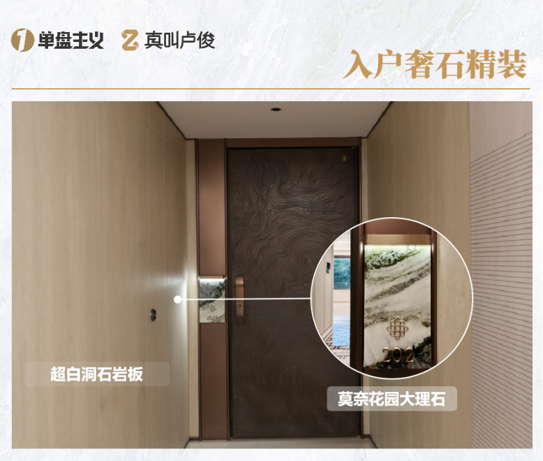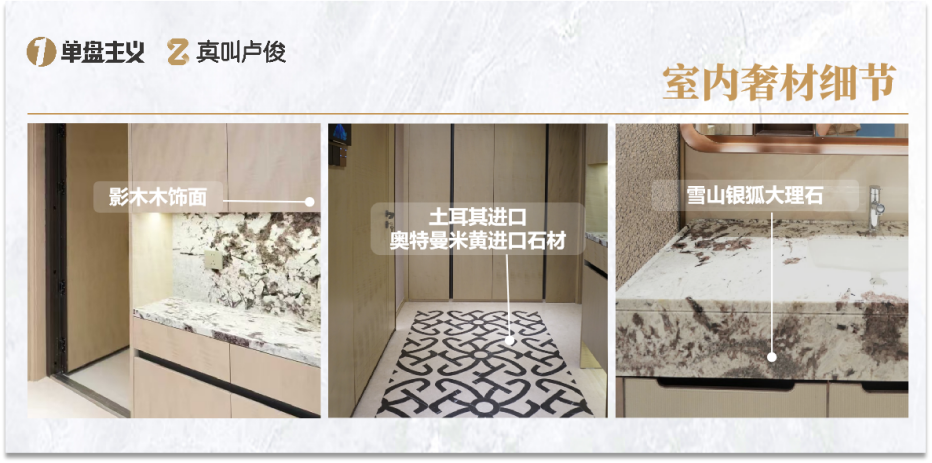 项目不惜成本,严选十余种珍贵奢石与臻质材料,外立面、门庭、公区、车库、室内等多重空间,皆以奢材精心雕琢。