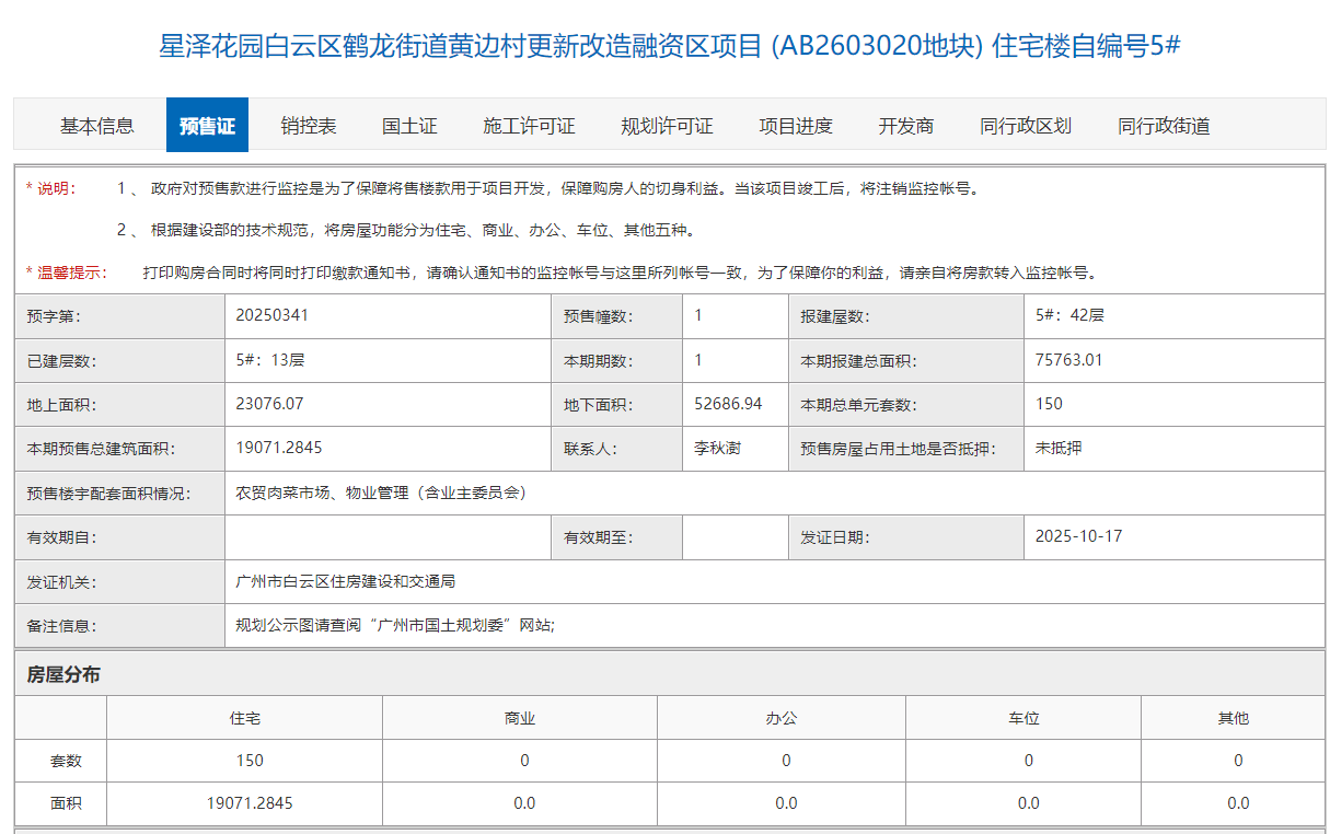 粤进深 赵盼盼 10月17日,据广州市住建局,白云巨无霸黄边村旧改项目——中建·白云之星新领预售证,批准预售住宅150套,预售总建筑面积19071.2845平方米。