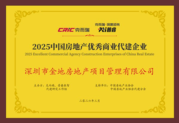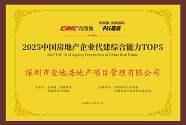 在本次大会期间,由中国房地产业协会和中国房地产业协会代建分会指导,克而瑞、普睿数智联合发布的“2025中国房企代建综合能力TOP10”研究成果显示,深圳市金地房地产项目管理有限公司跻身“2025中国房地产企业代建综合能力TOP5”,并荣膺“2025中国房地产优秀商业代建企业”、“2025中国房地产优秀资本代建企业”等殊荣,“深信服科技大厦”项目荣获“2025全国十大优秀代建项目”。