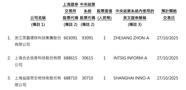 根据香港中央结算有限公司10月22日公告,众鑫股份(603091.SH)、合合信息(688615.SH)、益诺思(688710.SH)将于10月27日起在“沪港股票交易机制”(“沪港通”)下进行交易,并将会在同日被纳入成为中央结算系统合资格证券。该中华通证券的买卖会根据香港结算一般规则及香港结算运作程序规则在中央结算系统的持续净额交收制度下以人民币进行结算及交收。香港结算将不会就中华通证券提供实物股票记存及提取服务。