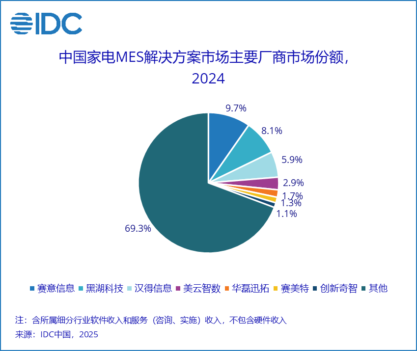 细分行业解决方案市场研究对象是直接为制造业客户提供实施服务的软件商和系统集成商,统计口径包括所属细分行业软件收入和服务(咨询、实施)收入,不包含硬件收入。西门子、SAP等厂商虽然也提供原厂的实施服务,但以集成商提供解决方案为主,未出现在细分行业解决方案厂商中。IDC数据显示,2024年中国MES解决方案总市场份额(含软件和服务,不含硬件)达到159.1 亿元人民币,年增长率为11.4%。在AI相关产业链市场带动、中小企业数字化转型、大规模工业设备更新等市场和政策的推动下,2024年高科技电子、船舶、汽车零部件、装备制造MES市场的增速显著高于整体水平。