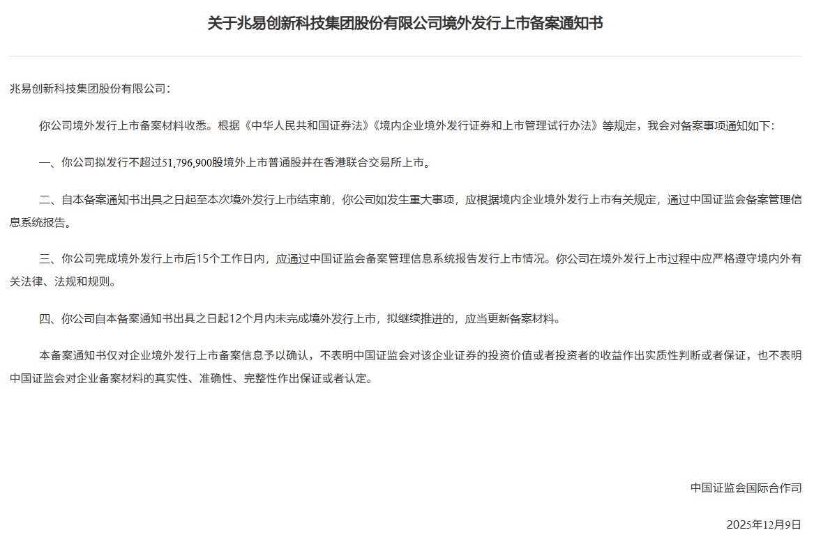 12月9日,中国证监会国际合作司发布《关于兆易创新科技集团股份有限公司境外发行上市备案通知书》。兆易创新(603986.SH)拟发行不超过51,796,900股境外上市普通股并在香港联合交易所上市。