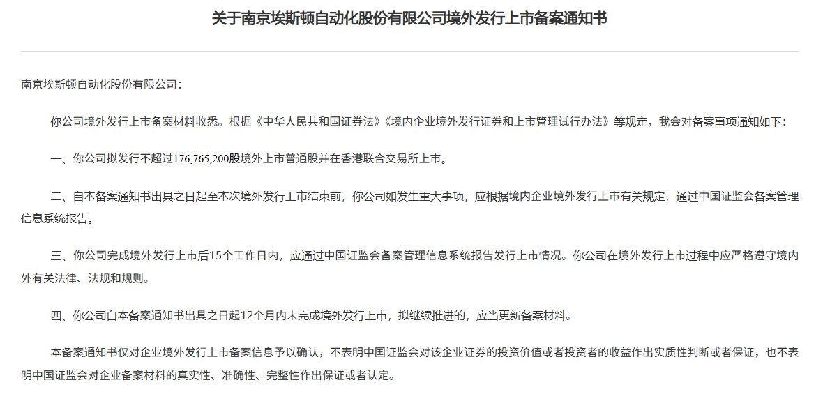 12月9日,中国证监会国际合作司发布《关于南京埃斯顿自动化股份有限公司境外发行上市备案通知书》。埃斯顿(002747.SZ)拟发行不超过176,765,200股境外上市普通股并在香港联合交易所上市。