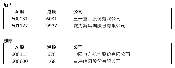 1月30日,中证指数有限公司与恒生指数公司宣布,截至2025年12月31日之中证恒生沪港通AH股精明指数的半年度指数检讨结果。中证恒生沪港通AH股精明指数将加入三一重工(600031.SH,06031)、赛力斯(601127.SH,09927),剔除中国东方航空股份有限公司(600115.SH,00670)、青岛啤酒股份有限公司(600600.SH,00168),成份股公司数目仍维持50只。