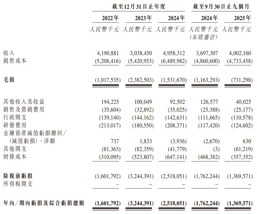 财务方面,于2022年度、2023年度、2024年度、2025年截至9月30日止九个月,公司实现收入分别约41.91亿元(人民币,下同)、30.38亿元、49.58亿元、40.02亿元;同期,录得年内╱期内亏损及综合亏损总额分别约16.02亿元、32.44亿元、25.18亿元、13.70亿元。