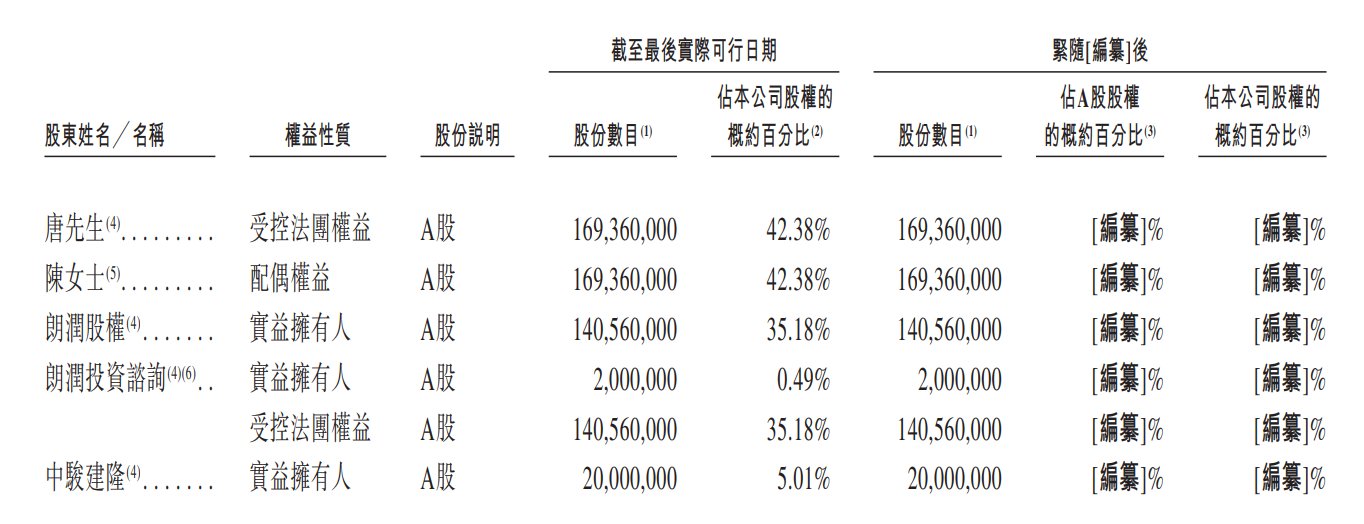 朗润股权为一家有限合伙企业,由唐先生及陈女士(作为有限合伙人)及朗润投资咨询(作为唯一普通合伙人)拥有。