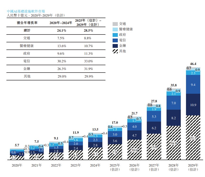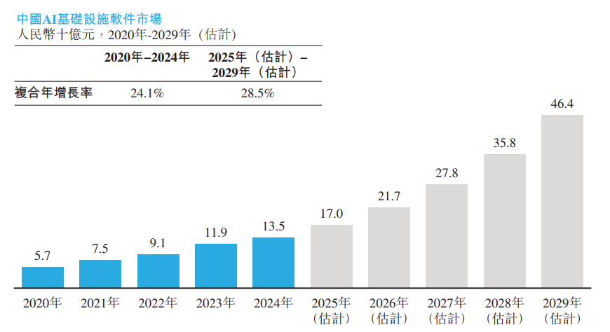 以收入计,中国AI基础设施软件市场规模从2020年的人民币57亿元增长至2024年的人民币135亿元,2020年至2024年复合年增长率为24.1%。展望未来,预计到2029年,中国AI基础设施软件市场规模(以收入计)将达到人民币464亿元,2025年至2029年复合年增长率为28.5%。