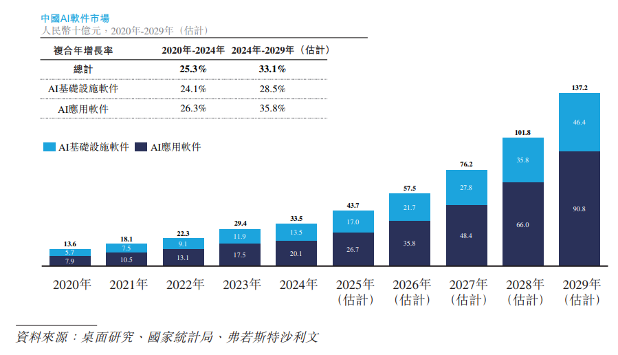 以收入计,中国AI软件市场规模从2020年的人民币136亿元增长至2024年的人民币335亿元,2020年至2024年复合年增长率为25.3%。展望未来,预计到2029年,中国AI软件市场规模(以收入计)将达到人民币1,372亿元,2025年至2029年复合年增长率为33.1%。