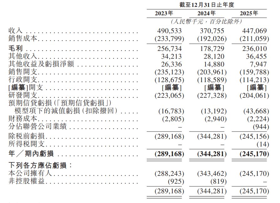 于2023年度、2024年度、2025年度,年╱期内亏损分别约为2.89亿元、3.44亿元、2.45亿元人民币。
