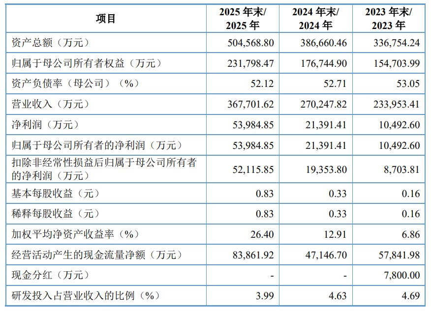 财务方面,于2023年度、2024年度、2025年度,公司实现营业收入分别约23.40亿元、27.02亿元、36.77亿元;同期,录得净利润分别约1.05亿元、2.14亿元、5.40亿元。