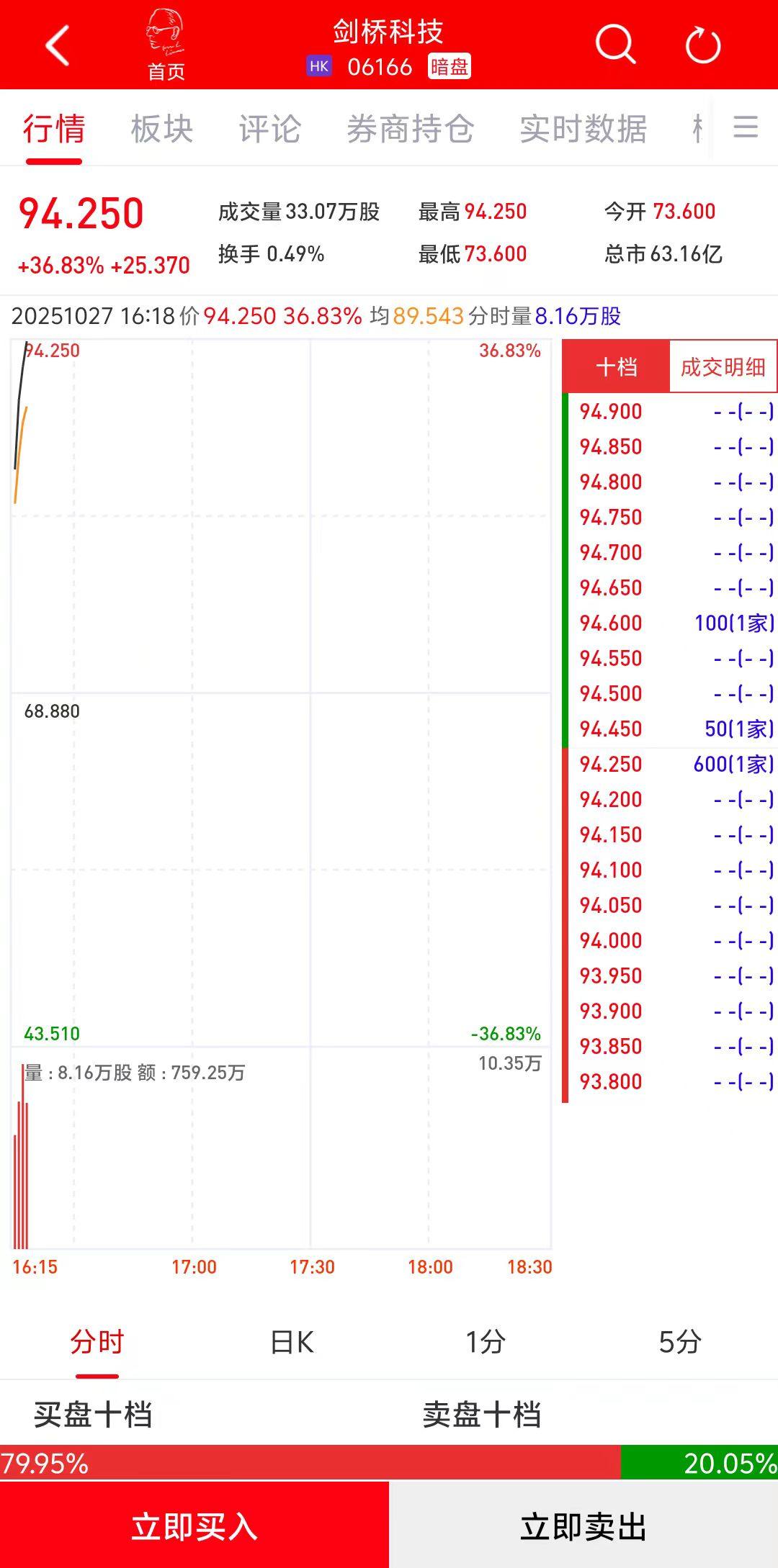 剑桥科技(06166)将于10月28日(周二)在香港挂牌。截至发稿,利弗莫尔证券暗盘交易显示报价94.25港元,较招股价68.88港元上涨36.83%,每手50股,不计手续费,每手赚1268.5港元。