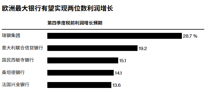 贷款业务也在回暖。净利息收入增长势头的增强应会推动意大利联合圣保罗银行(Intesa Sanpaolo SpA)以及英国劳埃德银行(LYG.US)的贷款利润增长,预计后者第四季度税前利润将翻一番以上。分析指出,随着西班牙国内经济的蓬勃发展,西班牙凯克萨银行(CaixaBank)甚至可能提高其净利息收入目标。