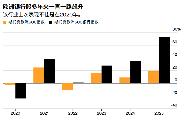 2026年伊始,欧洲银行股指数再上涨5%,达到2008年金融危机以来的最高水平。桑坦德银行、法国兴业银行和西德商业银行(Commerzbank)等公司在2025年均创下历史最佳业绩,涨幅都超过一倍。
