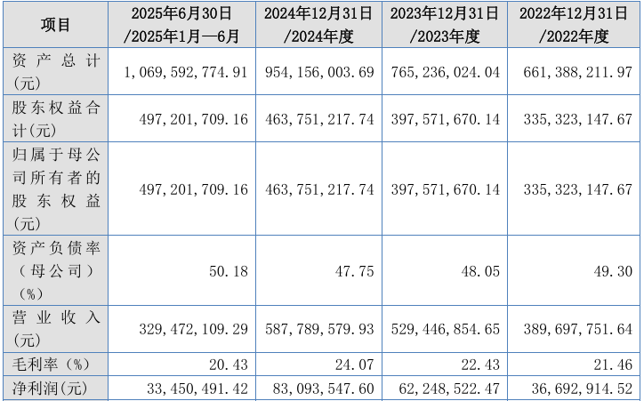 财务方面,于2022年、2023年、2024年及2025年1-6月,公司实现营业收入分别约为3.90亿元、5.29亿元、5.88亿元、3.29亿元人民币;同期净利润分别约为3669.29万元、6224.85万元、8309.35万元、3345.05万元人民币。